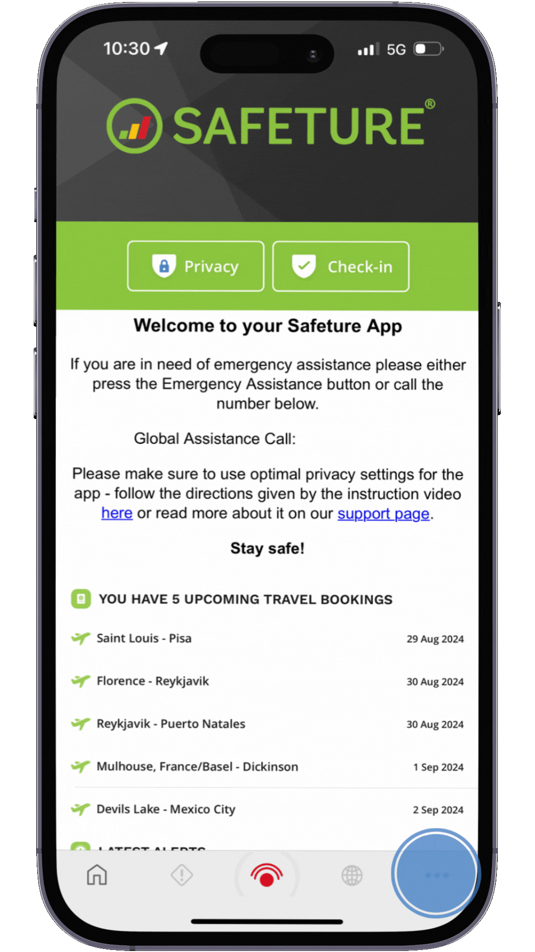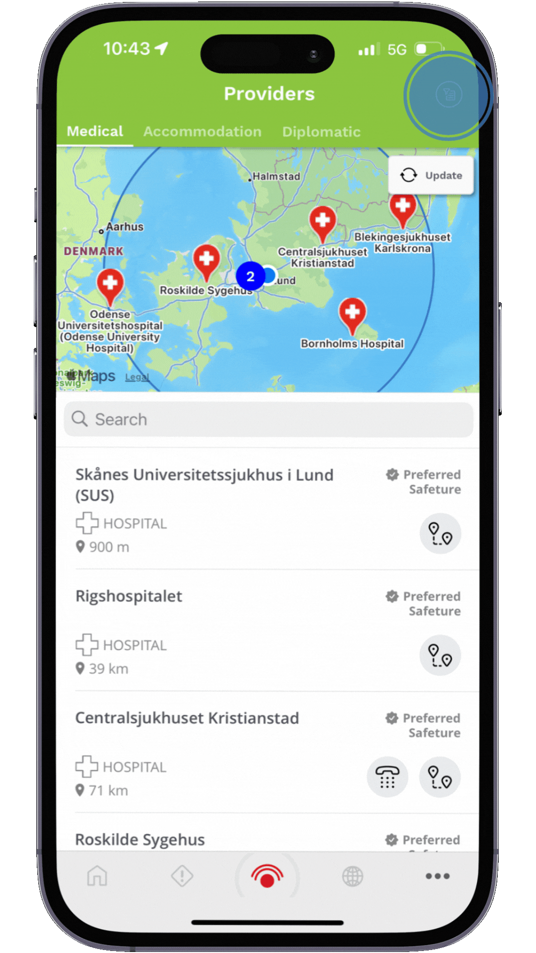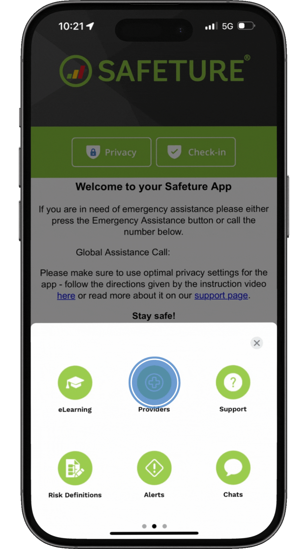 In the Providers section of the Safeture Mobile App, you can access information on nearby medical facilities, diplomatic services, and accommodation providers, each organized under its own tab. These providers are displayed on an interactive map to help you easily locate the nearest medical assistance, safe accommodations, or diplomatic services.